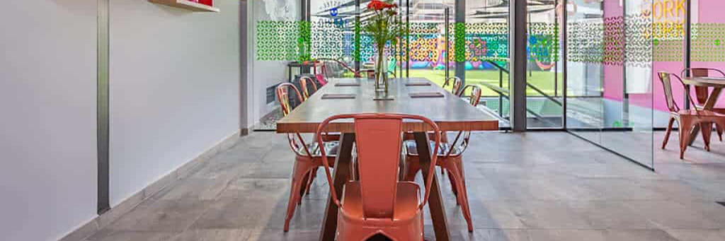 Shared kitchen, lockers, coworking area, Wi-Fi, and common areas.